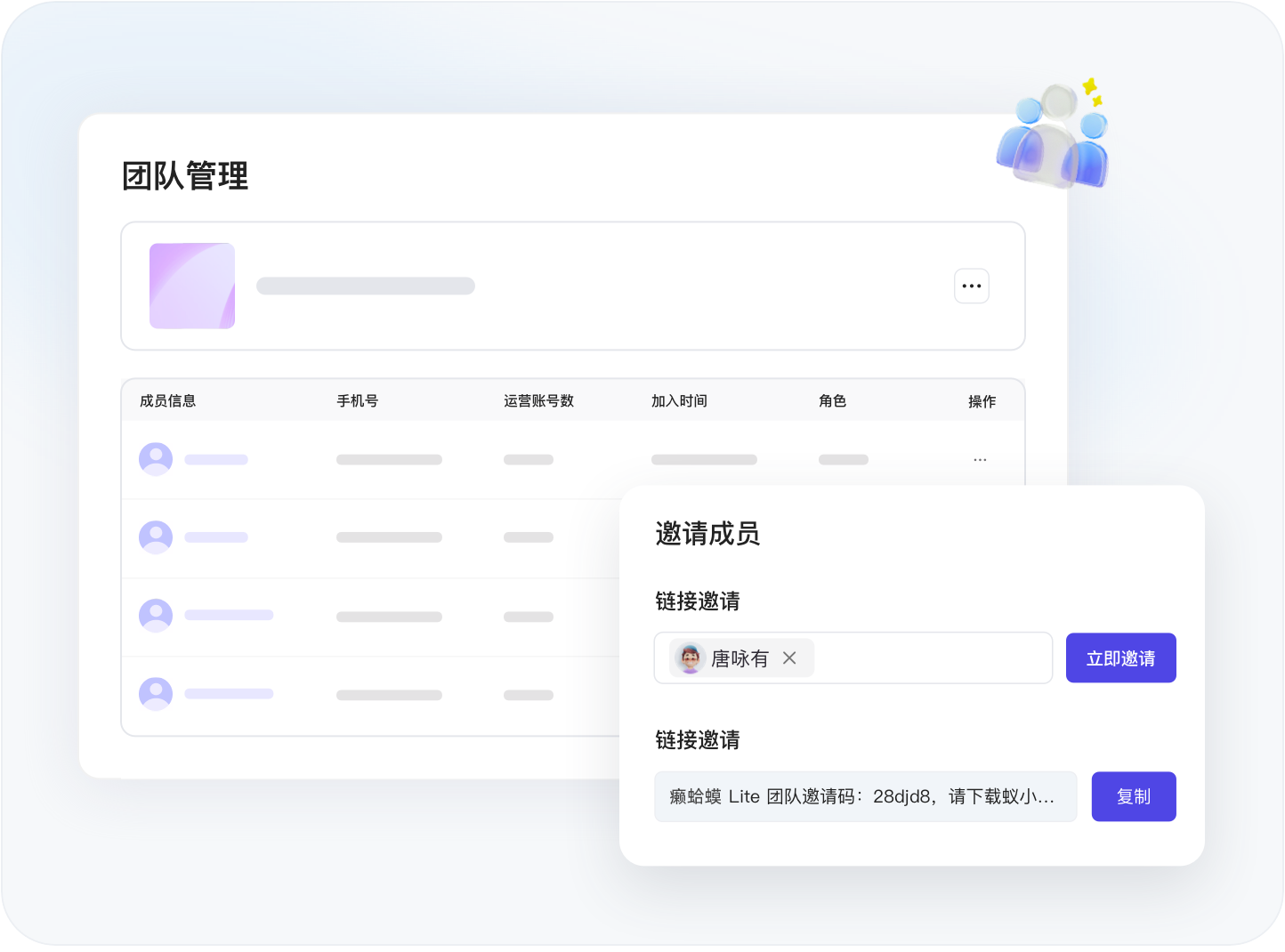 支持手机号、邀请码等方式邀请成员加入